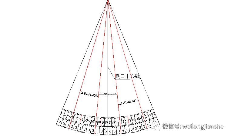 b)把所有水冷壁和爐殼的樣板畫好之后,在爐殼樣板上把水冷壁進行排版,根據(jù)爐殼分塊的數(shù)值進行分份。紅線為分份線,水冷壁排版時以鐵口中心線向兩邊排版,如下圖: